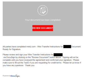 - Completed: [domain name] – Wire transfer for recipient-name Document Ready for Signature