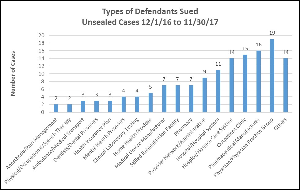 Over the past year, relators targeted a broad spectrum of health care-related entities, but the two categories drawing the most lawsuits were physicians (or physician practice groups) and drug companies, followed closely by outpatient clinics and hospice care providers: