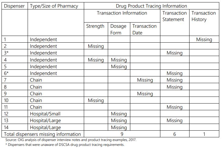 The OIG's most recent study focuses on dispensers of various sizes and types, including independent retail pharmacies, chain retail pharmacies, and small and large hospital pharmacies. Of the 40 dispensers interviewed, the agency found that all them had received at least some drug product tracing information from their trading partners, and 26 of these dispensers received all required elements of this information. The remaining 14 dispensers were missing a few of the required elements. Two of the dispensers were unaware of the DSCSA. The following table summarizes the missing information: