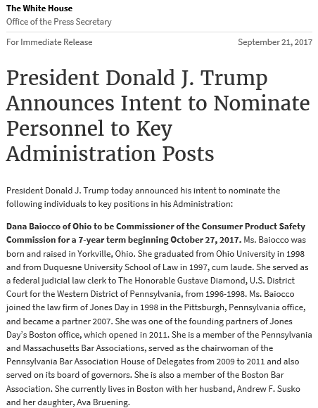 Today, President Trump announced his nomination of Dana Baiocco to be a Republican Commissioner on the Consumer Product Safety Commission. If confirmed, Ms. Baiocco would take the seat of Commissioner Robinson, whose term expires on October 26, 2017.