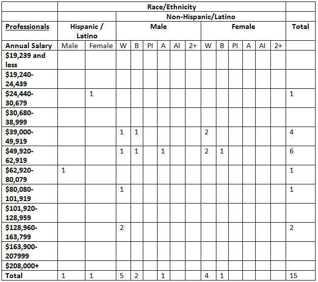 Let’s look at an example for an employer who has 15 employees in the “Professionals” job category (which encompasses a wide variety of positions including HR specialists, accountants, IT analysts, and engineers). Under the current reporting requirements, the employer’s EEO-1 report would look something like this: