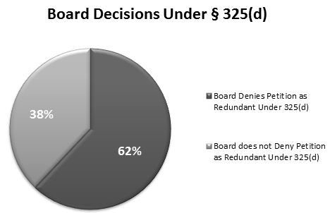 Chart: The chart (above) displays the frequency with which the Board refused to institute an IPR or CBM trial due to redundancy under §325(d). The data used to compile this chart considered only those cases addressing multiple IPR and/or CBM Petitions. It excludes decisions where the Board considered the issue in the context of prior art from the original or reexamination prosecution.