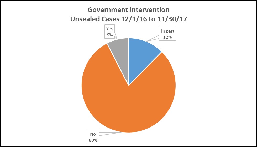 Under the FCA, qui tam actions are filed under seal to permit the government to investigate relators’ claims and determine whether to intervene. Our data shows that, on average, cases remain under seal for over two years, well in excess of the 60-day period specified in the FCA. However, lengthy investigation periods are not translating to more frequent intervention, as the government elected to intervene in only one in five cases unsealed in the twelve months ended November 30, 2017: