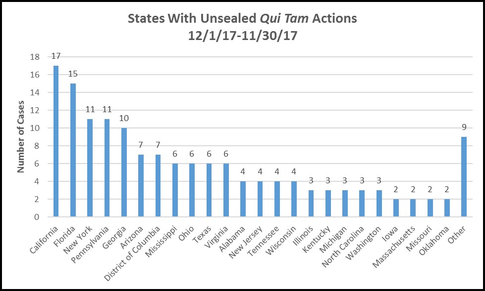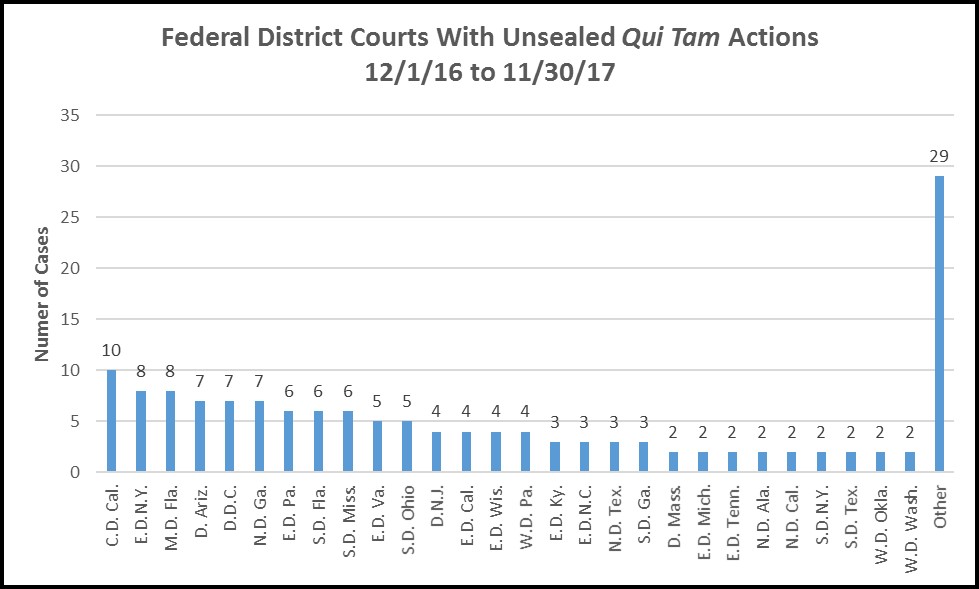 The qui tam actions unsealed in the twelve months ended November 30 2017 were filed in 57 different districts located in 33 different states. Looking at how actions clustered by state, we found that large-population states topped the list: