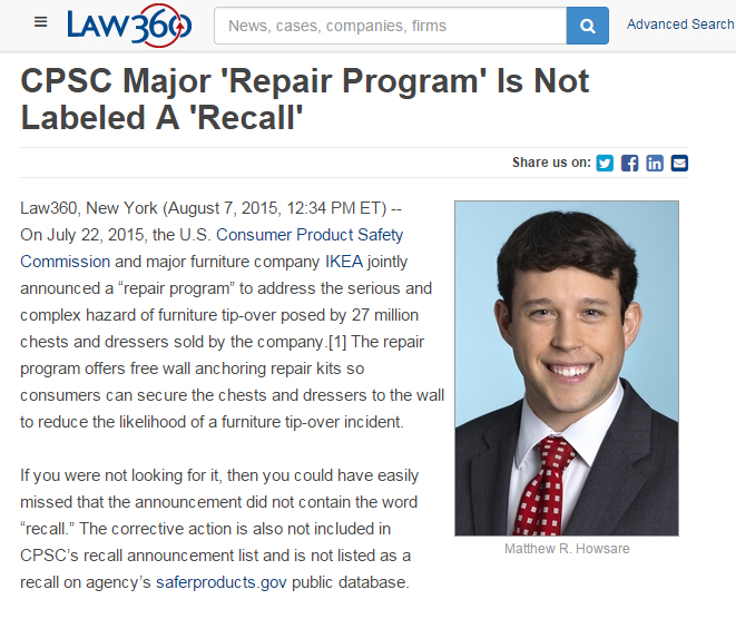 While some may say that this corrective action is an exception due to the high profile of the company involved, the nature of the furniture tip-over hazard and the high number of units affected, it could just as easily be said that this corrective action demonstrates that media attention and consumer response is directly related to the characteristics of each individual corrective action itself and not necessarily what the corrective action is labeled. Certainly, here, the media response was no less vibrant because the corrective action was called a “repair program.” Additionally, IKEA has already described the consumer response to its program as “quite robust.”