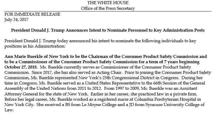 Today, President Donald Trump officially announced his intent to nominate Acting Chairman Ann Marie Buerkle to be the permanent Chairman of the U.S. Consumer Product Safety Commission. Her new seven year term will begin on October 27, 2018 when her first term is set to expire. If confirmed, she will become the permanent Chairman immediately and her new term will end in October 2025.